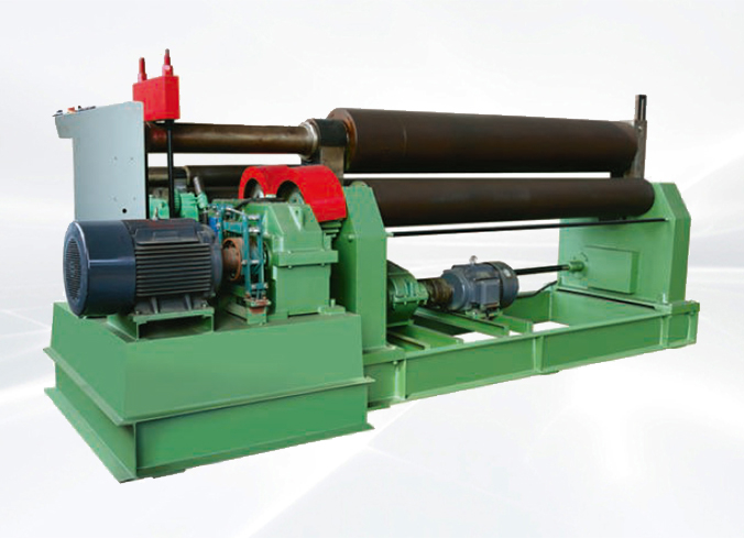 該機(jī)結(jié)構(gòu)型式為三輥非對稱式,下輥為主傳動,并做垂直升降運(yùn)動,以便夾緊板材。通過下輥齒輪與上輥齒輪嚙合,同時作為主傳動,側(cè)作傾升降運(yùn)動。具有預(yù)彎、卷圓多重功能,結(jié)構(gòu)緊湊操作維修方便