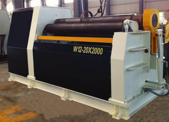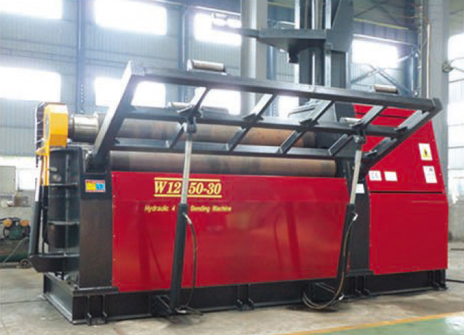本機(jī)結(jié)構(gòu)型式為三錕對(duì)稱式,上輥在兩下輥中央對(duì)稱位置作垂直升降運(yùn)動(dòng),通過(guò)液壓缸內(nèi)的液壓油作用于活塞而獲得,為液壓傳動(dòng);兩下作旋轉(zhuǎn)運(yùn)動(dòng),通過(guò)減速機(jī)的輸出齒輪與下輥齒輪嚙合為卷制板材提供扭矩。本機(jī)床結(jié)構(gòu)緊,操作維修方便。