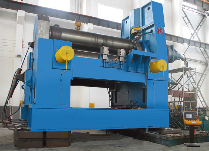 水平下調式卷板機是國內外市場比較常見的卷板機,一般采用液壓驅動,上輥是固定旋轉動力輥,根據不同的工藝需求,在工作過程中,兩個側輥在預設的弧線軌跡上移動,與上輥共同夾制板材,上旋轉完成對板材的卷圓或卷弧工作。